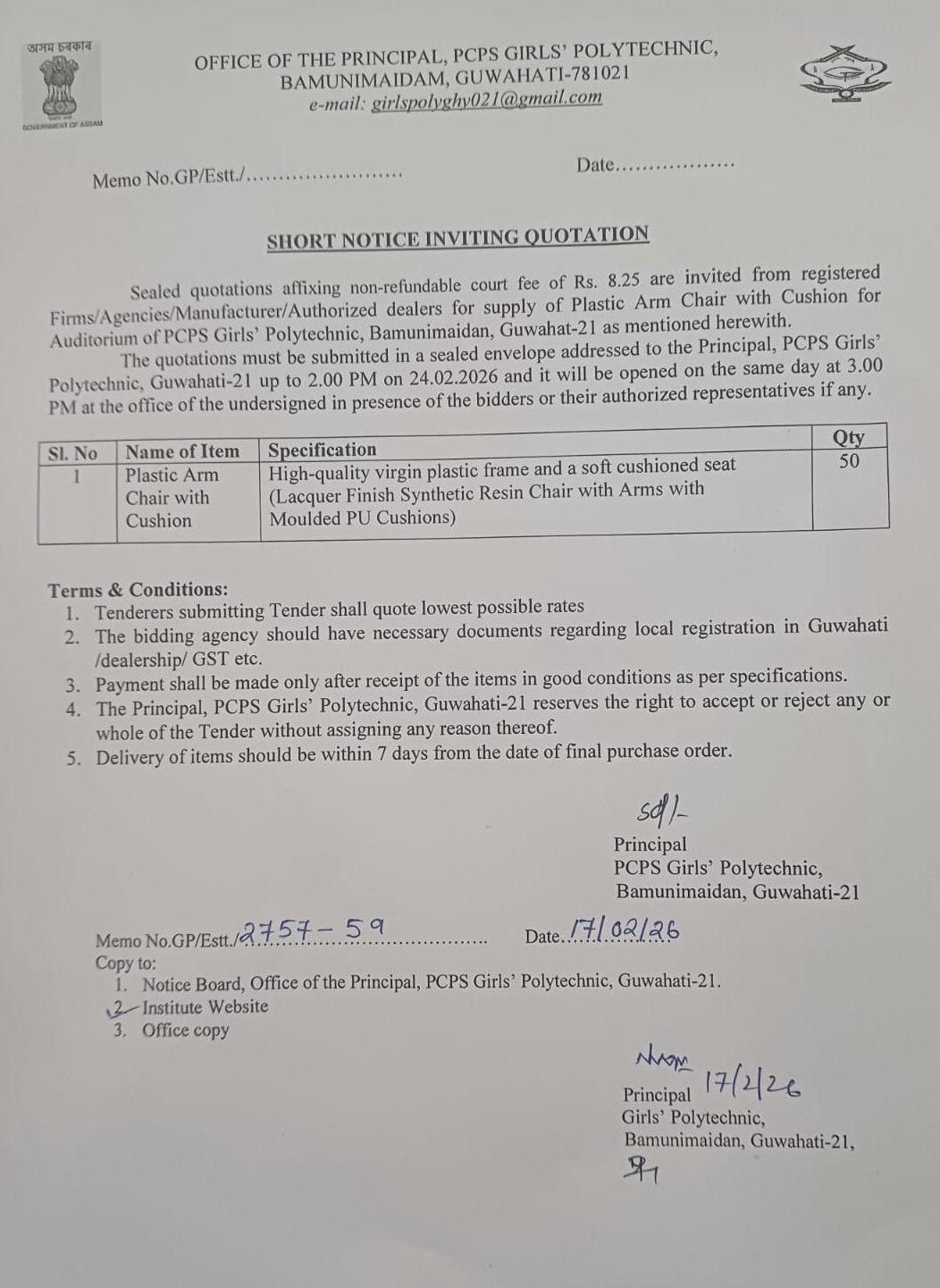 Short Tender Notice for Plastic Chair for Auditorium (Published On: 20/02/2026)